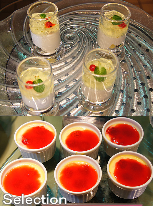 ココナッツパインムースとライムゼリー(上)ラズベリーのクレームブリュレ(下)