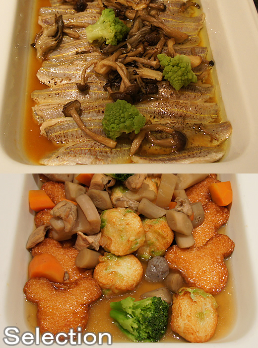 白身魚のスチームレモン醤油ソース(上)さつま揚げと根菜のポトフ(下)