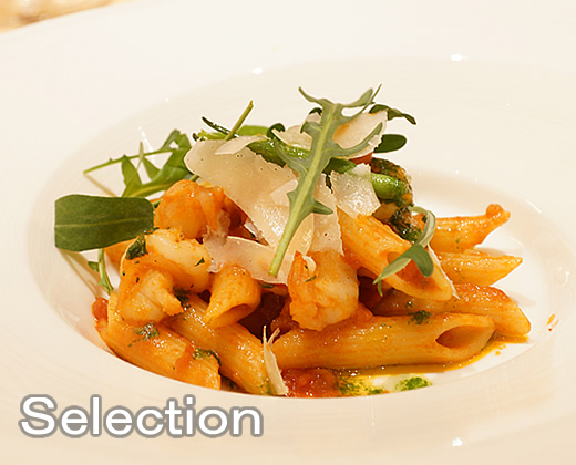シュリンプと金針菜のペンネ、トマトクリームソース
