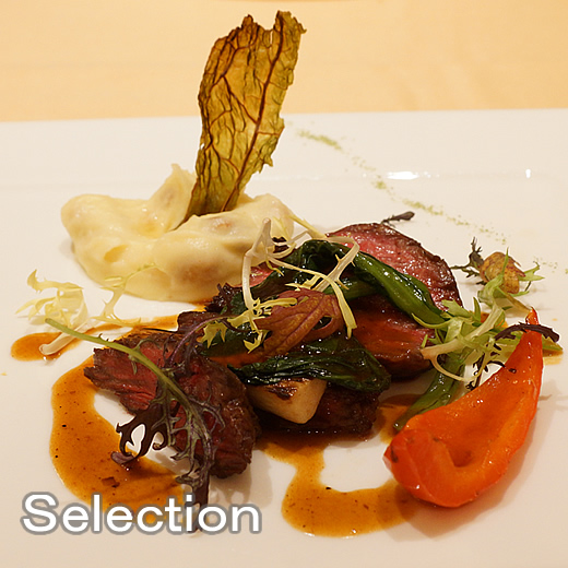 牛ハラミのステーキ ヘーゼルナッツ入りマッシュルームポテトとベビーリーフ添え