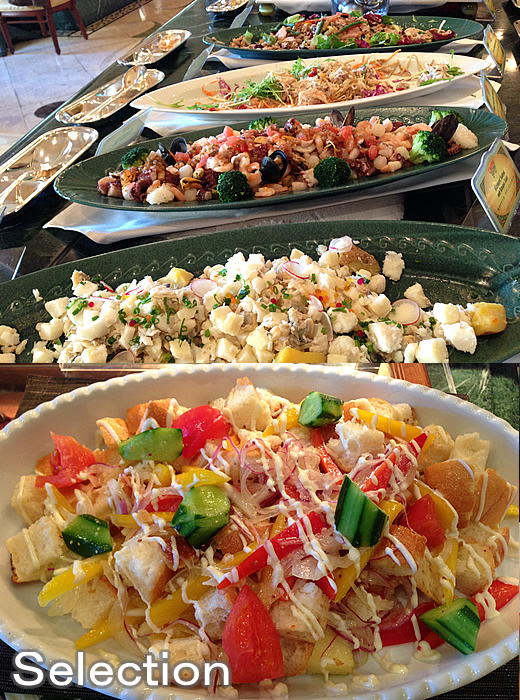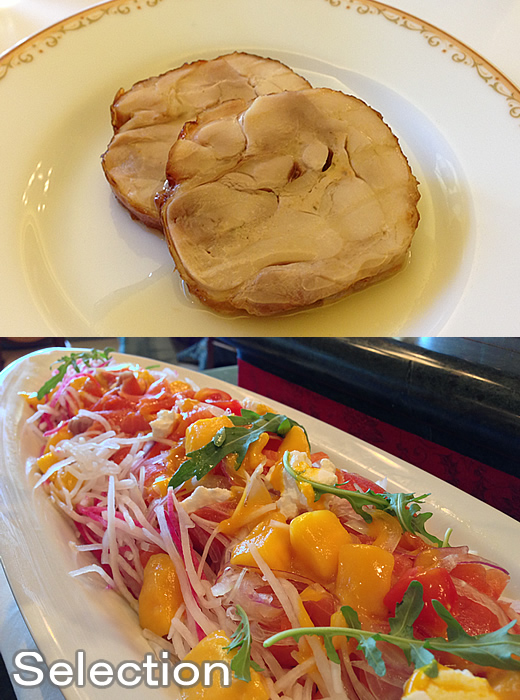 チキンのガランティーヌ(上)スモークサーモンとマンゴーサラダレモン風味のリコッタ添え(下)