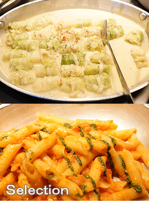 ロールキャベツ(上) ペンネ、蟹とトマトのソース(下)