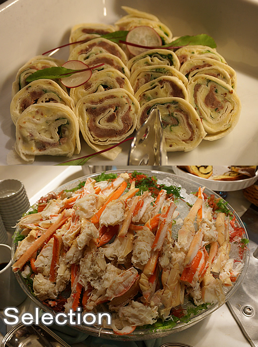 鴨のコンフィとポテトのトルティーヤロール(上) ズワイガニ(下)