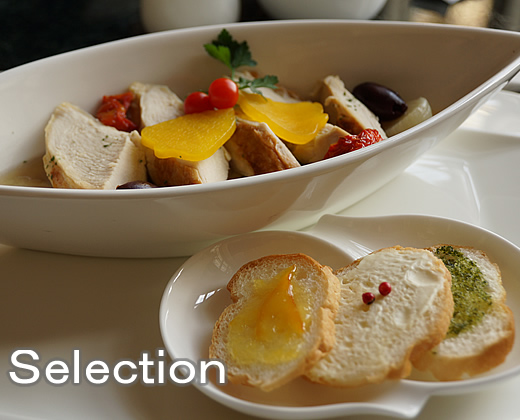 チキンと野菜の軽い煮込み、三種類のクロスティーニ添え