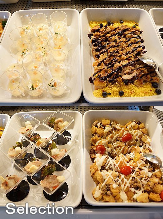 スモークサーモンのパンナコッタ(左上)チキンと香草マリネ・ブルーベリーソース(右上)