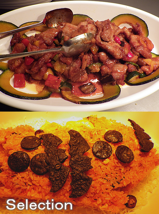豚肉と野菜の甘辛炒め(上) ブラックソーセージ入りジャんバラヤ(下)