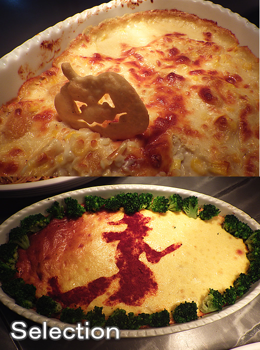 パンプキングラタン(上) ブロッコリーとスモークサーモンのキッシュ風(下)