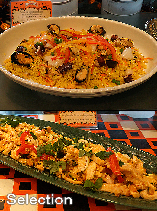 シーフードと野菜のライスサラダ(上)チキンとパンプキンのスパイシーマリネ(下)