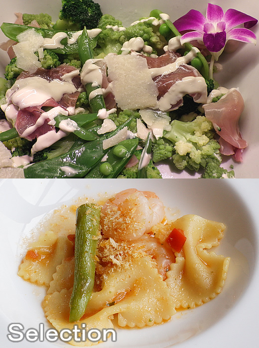 季節野菜のマリネ・アンチョビソース(上) 海老とアスパラガスからすみ添えパスタ(下)