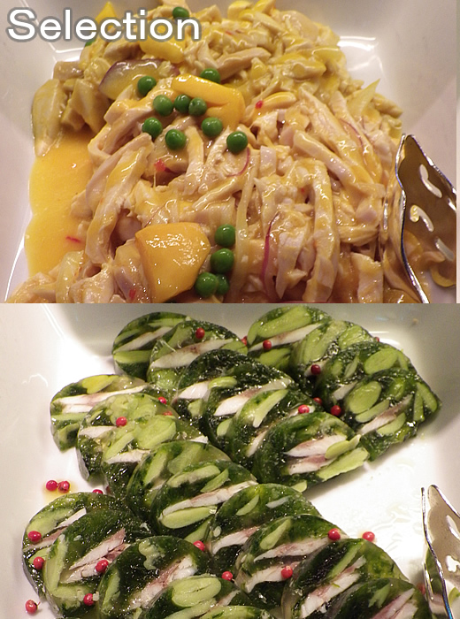 スチームチキン・マンゴチリソース(上) 鯵と海苔のアスピック(下)