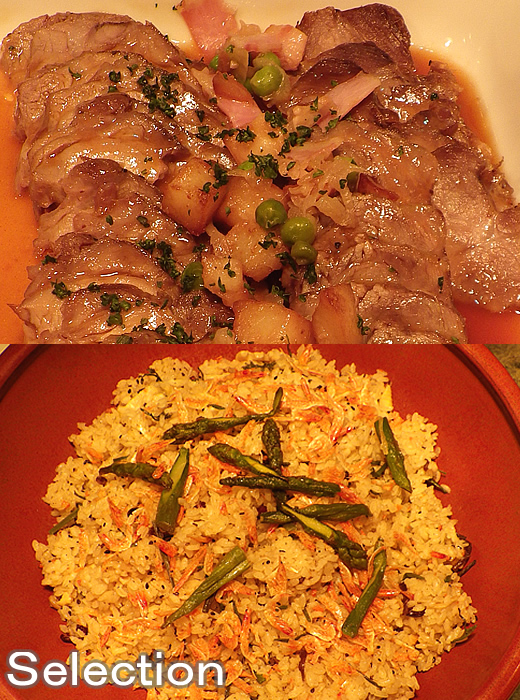 ローストポーク・ハチミツとラベンダーソース(上) 桜海老と山菜の五穀米ピラフ(下)