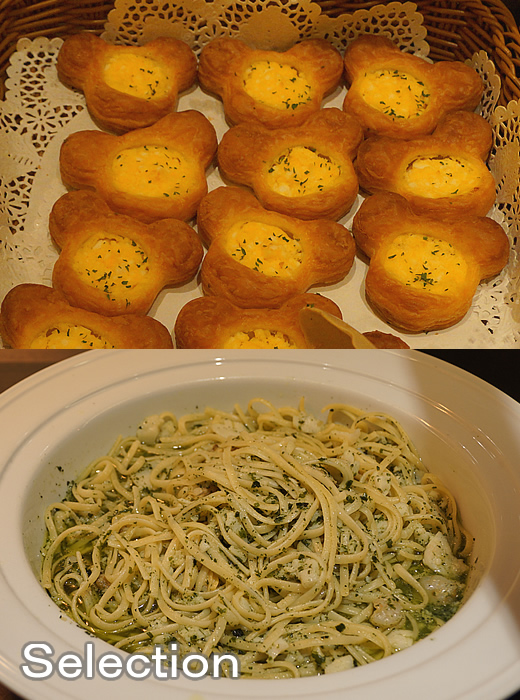 エッグパイ(上) シーフードとワカメのパスタ(下)