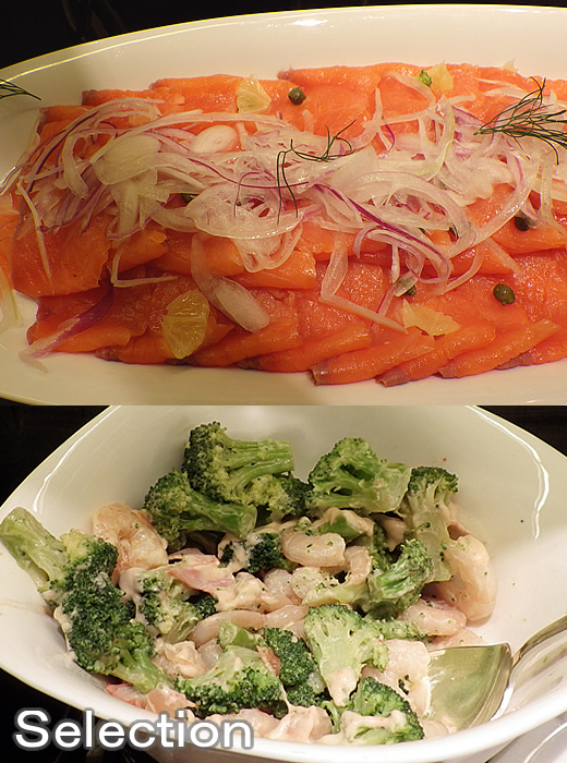 サーモンのマリネ(上) シュリンプとブロッコリーの明太子マヨネーズ(下)