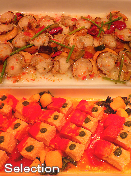 帆立貝のソテーラビゴットソース(上) 鮭の味噌焼き(下)