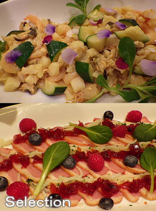 シーフードマリネ・サフランドレッシング(上) 鴨胸肉のサラダ(下)